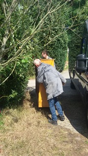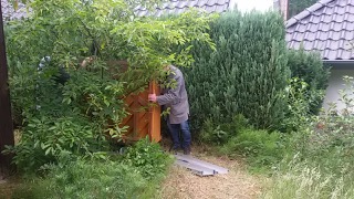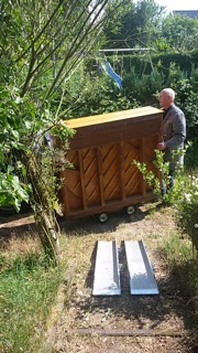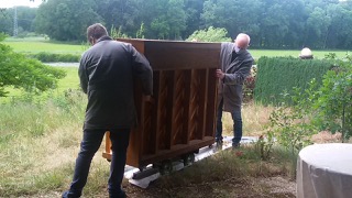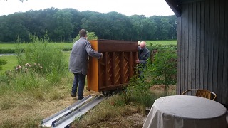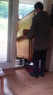 Hier erstmal die Transport-Arie: Das alte Klavier bekränzt mit Abschiedsblumen und der Abtransport durch den buckligen Garten. Ein Hoch auf die Helden von Firma pianissimo. Das mit den Schienen sieht jetzt so leicht aus, ist es aber, gerade bei engen Kurven und Niveauunterschieden, überhaupt nicht. Es ist nur immer noch besser als Tragen, bei 300 kg Klavier.