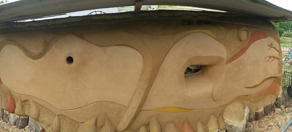 Ich hatte mich ja entschlossen, doch nicht die Nachtfähre zurück zu nehmen, sondern die am nächsten Tag um 14:00 Uhr, damit ich nicht am letzten Kurstag immer unter Zeitdruck wäre und an den letztmöglichen Zug dächte. Von daher hatten wir alle jetzt die Ruhe weg und fanden immer noch mehr Ecken, wo wir nachschnitzen und noch mehr bunten Putz und bunter Farbe aufbringen mussten. Und die Kanten zwischen zwei verschiedenen, aber gleich hohen Putzschichten, die eigentlich NIE ordentlich werden, solange man noch kein japanischer Master Plasterer ist, die kann man dann (bei Lehm noch länger, bei Kalk immerhin so lange, bis er zu hart dafür ist) mit scharfem Messer und der berühmten 45°-Kante in herrlichen Linien in Form schneiden, so dass das alles genau so gewollt aussieht.