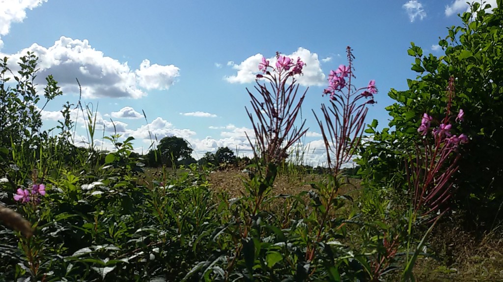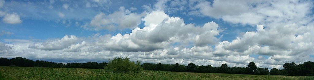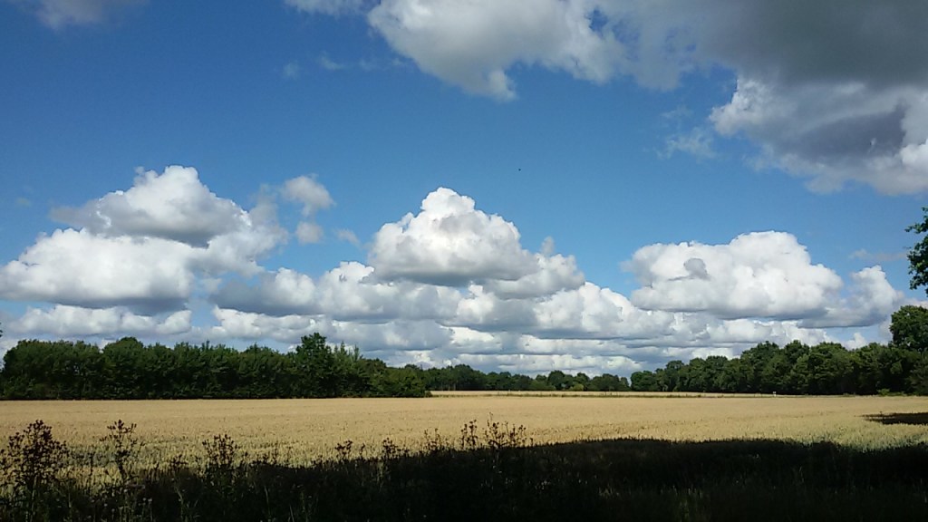 Mittwoch war es schon weniger feucht und die Landschaft zum Teil großartig. Wie im Dänemark-Urlaub. Eindrucksvolle Wolken, wie Brotteig auf die unterste Luftschicht geklopst, so dass sie unten ganz plattgematscht waren und oben wie Baiser. Und Kornfelder und Weidenröschen.