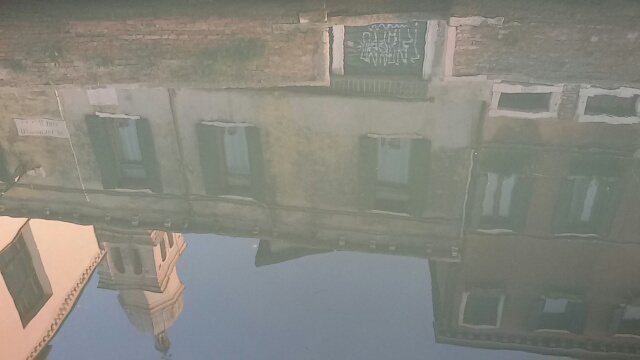 Und immer und immer wieder verzaubern mich diese Spiegelungen. Wenn ein Rio (für die Venezianer gibt es nur einen Kanal, das ist der Canale Grande, alles andere, was wir mit Amsterdam-Erfahrung als „Kanäle“ bezeichnen, sind keine. Sie sind ja auch nicht gegraben, sondern die noch vom Meer übrigen nassen Stellen zwischen den Inseln) – wenn also ein Rio ganz glatt da liegt und man das Foto auch umdrehen könnte und als Architekturpostkarte verkaufen – und dann kommt ein Boot und verquirlt das Wasser, und dann gibt es ein paar Minuten die irresten Muster, bis die Gebäude wieder klar werden. Das ist zwar mindestens so ein Anthroposophenfernseher wie das heimische Aquarium, aber es fasziniert mich total.