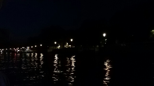 Auf der Rücktour war die Wahl zwischen drinnen Sitzen und draußen Stehen, und ich blieb draußen. Es wurde dunkel, und man kann dann ganz wunderbar durch die gardinenlosen Fenster sehen und feststellen, dass diese Paläste von innen noch original 17. oder 18. Jahrhundert sind, mit Deckenfresken, riesigen Kronleuchtern und wandgroßen Ölgemälden. Sie sind alles, nur nicht gemütlich.