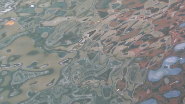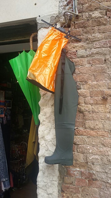 Es stand noch nicht der ganze Markusplatz unter Wasser, aber doch weite Teile, und es gluckerte munter immer weiter aus den Löchern in den Bodensteinen. Barfüßige Touristinnen staksten von einem vorausschauend aufgebauten Steg zum anderen rüber, die Händler mit den Gummigaloschen zum Überziehen machten schlagartig gute Geschäfte. Und als ich die Gasse hinterm Markusplatz entlanglief, um von der anderen Seite aus zu gucken, fing sie an, vor mir UND hinter mir vollzulaufen, so dass ich zugesehen habe, mich in höher gelegene Gegenden zurückzuziehen.