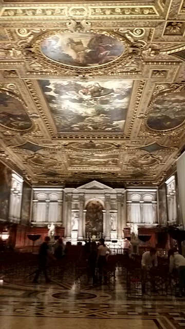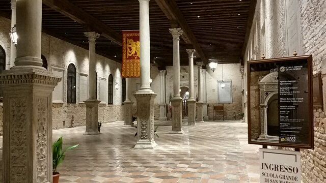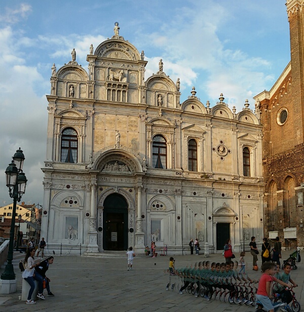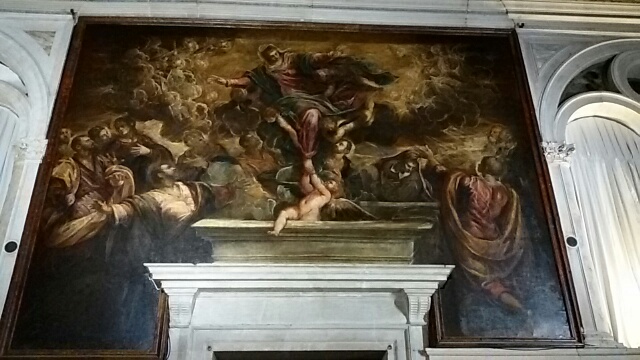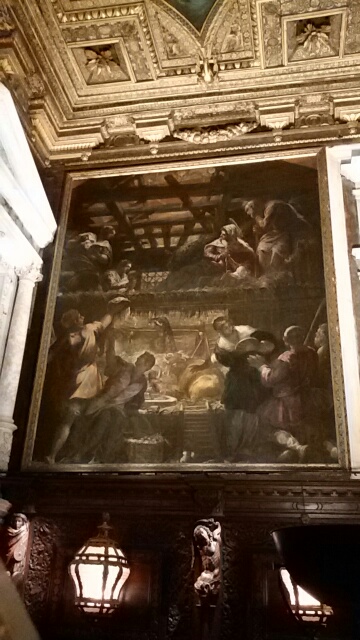 Nachdem ich ja nun so viel Interessantes über Tintoretto gehört hatte, nicht nur, dass er seine Tochter ebenso ausgebildet hat wie seinen Sohn, auch, dass er mit 20 schon fertiger Meister war (Malermeister – das wird man heute meist später, selbst wenn man die Wände nur einfarbig bemalt) und stolz auf seine Herkunft aus einfacher Färber-Familie (Tintoretto ist bloß der Spitzname dieses Jacobo Robusti und heißt zu deutsch „Färberlein“) und so – da wollte ich nun endlich die bisher immer ausgelassene Scuola Grande di San Rocco besichtigen, die er quasi im Alleingang ausgemalt hat.