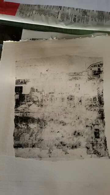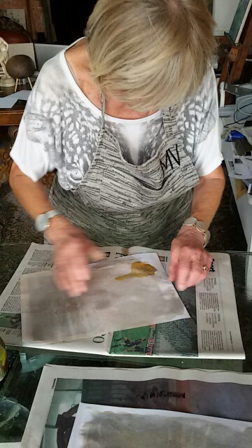 So aber eilten Rena und ich unbehindert bis ganz ans Ende, da wo plötzlich der Rio wieder an die Oberfläche kommt, und drängten uns am rechten Ufer an Second-Hand- und Schmucklädchen vorbei bis zum Atelier „Oiavoi“. Der Künstler gab uns Schürzen in praktischem Schwarzgrau mit MV-Monogramm und das handgeschriebene Rezept für die Technik und alles, was man dazu braucht, zum Abfotografieren. Dann legten wir los, beschellackten die Rückseite von lasergedruckten Venedigfotos, möglichst ohne dabei alles unter Schellack zu setzen, föhnten, entfernten das oberste Blatt des Unterlage-Zeitungsstapels, gummierten die Vorderseite (ohne dabei alles unter Gummilösung zu setzen und ohne irgend ein Fleckchen auszulassen), föhnten wieder, bis das Papier knisterte, und rollten dann dicke schmierige pechschwarze Druckfarbe drauf.