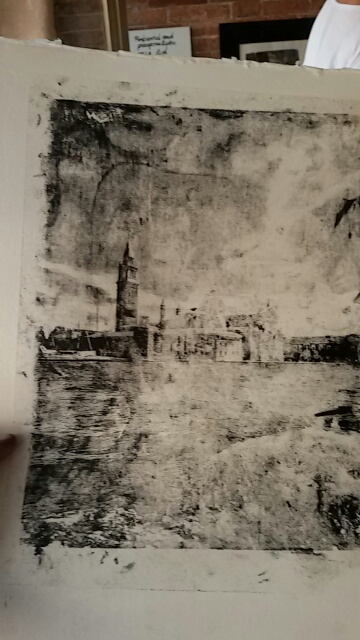 Das alles war deutlich trickier als es hier klingt. Die erste Lage muss nämlich einfach zügig verteilt werden, aber nicht bis zum Rand, damit es keine Schweinerei gibt, und dann darf man bloß nicht weiter zügig verteilen, sondern muss mit aller Kraft und allem Gewicht diese Walze ins Papier stemmen, damit auch das letzte Fleckchen Ölfarbe platt- und in die Poren des Papiers gequetscht wird. Jedenfalls da, wo das Blatt nicht von Gummi bedeckt ist. Also überall, wo die Plastikteilchen des Laserdrucks das Papier schon abgedeckt haben. Rena war liebevoll und zartfühlend mit ihrer Walze, und Roman sagte immer: „Richtig draufdrücken. Mehr Gewicht! Noch mehr!“ Und er zeigte es uns und lehnte sich auf seine Walze, dass der Glastisch sich mehrere Zentimeter durchbog. Ich hatte bis dahin keine Ahnung gehabt, dass Glastische sich überhaupt biegen KÖNNEN! Er meinte aber, der Tisch hielte das schon aus. Da er das seit zwanzig Jahren macht, wirds wohl stimmen. Wenn die Farbschicht absolut lückenlos tiefschwarz ist (notfalls mit dem Daumen und viel Gewicht nachbügeln), sprüht man eine Menge Wasser auf die ganze Sache und fängt dann mit einem äußerst ramponierten Aquarellpinsel an, die Farbe extrem sanft und liebevoll wieder runterzunehmen. Und wenn das leicht geht, hast du in der Runde davor zu wenig aufgedrückt. Bei mir ging es ziemlich einfach, was ich ganz angenehm fand. Alle 30 Sekunden muss man den Pinsel mit einem Pabypopotuch reinigen (mit einem unbenutzten), damit er wieder Farbe aufnehmen kann. Und Stück für Stück schält sich aus dem nachtschwarzen Schlick wieder die venezianische Gasse mit der Wäscheleine oder die Kirche Santa Maria della Salute raus. Das ist toll, weil es sich so ANFÜHLT, als würde man malen, bloß sieht das Ergebnis viel überzeugender aus als sonst. Man muss aber vorsichtig sein, dass man das Papier nicht durchpinselt, es ist immerhin nur normales Druckerpapier trotz aller Vorbehandlung. Und wenn dann nach erstaunlich langer Zeit die schwarze Farbe weggeputzt, das Papier noch nicht durchlöchert hat und das Motiv klar zu sehen ist, dann kann man drucken. Entweder mit so einer Art Wäschemangel oder einfach mit einem Esslöffel auf der Rückseite des auf die „Druckplatte“ gelegten Büttenpapiers reibend.
