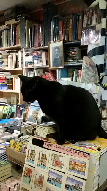 Mehrere Katzen arbeiten da mit, räkeln sich auf Bücherstapeln und animieren die Kunden zum Kauf. Da die „Acqua-Alta“-Buchhandlung inzwischen in etlichen „Geheimtipp!“-Büchlein besprochen wurde, ist es kein Geheimtipp mehr, sondern eine weitere Besucherattraktion und hat deshalb jetzt auch Gondel-Kühlschrankmagneten, historische Venedigdrucke und Reiseführer, aber dennoch: Das ist mal ein Laden, der verblüfft.