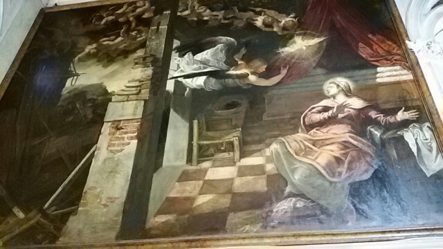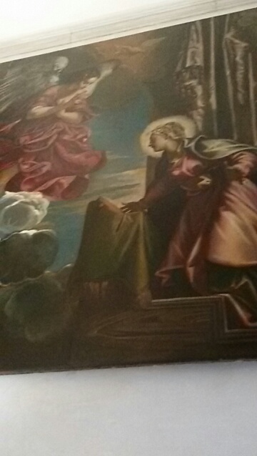 Hier zum Beispiel sind drei Verkündigungsszenen verschiedener Urheber, die alle da in der Scuola hängen. Zwei mit anmutig schwebenden Engeln und demütig ihr Schicksal hinnehmender Maria (unbekannt und Tiepolo). Bei Tintoretto ein Engel im Sturzflug und eine Maria, die aussieht als ob sie richtig zulangen könnte, falls die heiligen drei Könige zu viel Weihrauch um die Krippe wedeln, mit Händen wie ein Bauarbeiter und einem Gesichtsausdruck, der ganz klar „WATT willst du?!?! Bleib mir bloß wech mit SO watt!“ sagt.