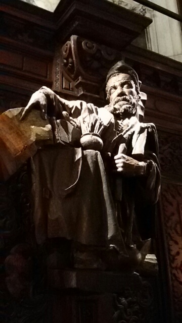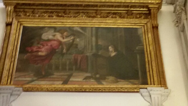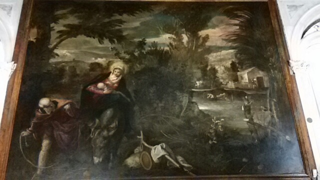 und das größte grob geschätzt fünf mal zehn. Eine Kreuzigungsszene in Originalgröße und das reinste Wimmelbild. Das Kreuz selbst steht zwar in der Mitte, ist aber in zurückhaltenden Farben gestaltet, auch die weinende Familie drumrum wird sozusagen als bekannt vorausgesetzt. Mit Spot-Beleuchtung ins Scheinwerferlicht gerückt werden ganz andere Szenen. Jeweils ein faszinierter Zuschauer rechts und einer links, die sich auf irgend einen Felsen stützen und beobachten. Ein Hund, der mitten zwischen den ganzen Leuten liegt. (Hatte Domenico nicht mal gesagt, dass Hunde auf religösen Bildern immer für Fidelitas, also Treue bzw. Glauben stehen?) Außerdem sieht man die Leute, die damit beschäftigt sind, den Nachbar-Delinquenten zu kreuzigen, sich so sehr mühen, dass man versucht ist, ihnen zu Hilfe zu eilen. Und versteckt in eine Lücke gezwängt kauern zwei, von denen man sich erst fragt, was sie da bitte treiben, bis man dann sieht, dass sie Würfel in der Hand haben. Also jedenfalls erzählt das Gemälde ganze Romane, und man wünscht sich eine Bilderbuch-Oma, die es mit einem anguckt und immer sagt: „Oh, und sieh mal hier, was der macht! Was glaubst du, warum? Was der wohl vorhat? Ach, und das Pferd hier, das hebt das Bein so komisch! Ob das mal…?“ Zum Glück steht eine Reihe Regiestühle am Rand (immer einer richtigrum und zwei falschrum wegen der Abstände), und man kann sich hinsetzten und ewig lang gucken. Da ich in der Mittagszeit da war, war es auch ziemlich leer.