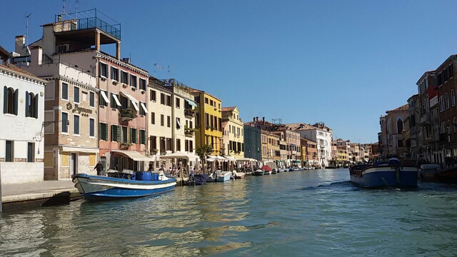 Die Linie 5.2 fährt nicht durch den Canale Grande, sondern außen rum, zwischen Zattere und Giudecca durch (für alle, die die Stadtgeographie im Kopf oder auf google haben) und dann am Hafen vorbei. Weniger idyllisch, aber viel schneller. Und die Boote sind nicht so voll. Und schön ist es immer noch, hier Blick auf die Zattere (das Ufer, wo früher die Holzflöße (= Zattere) an Land gebracht wurden, um da Pfeiler für die nächste Villa draus zu machen):