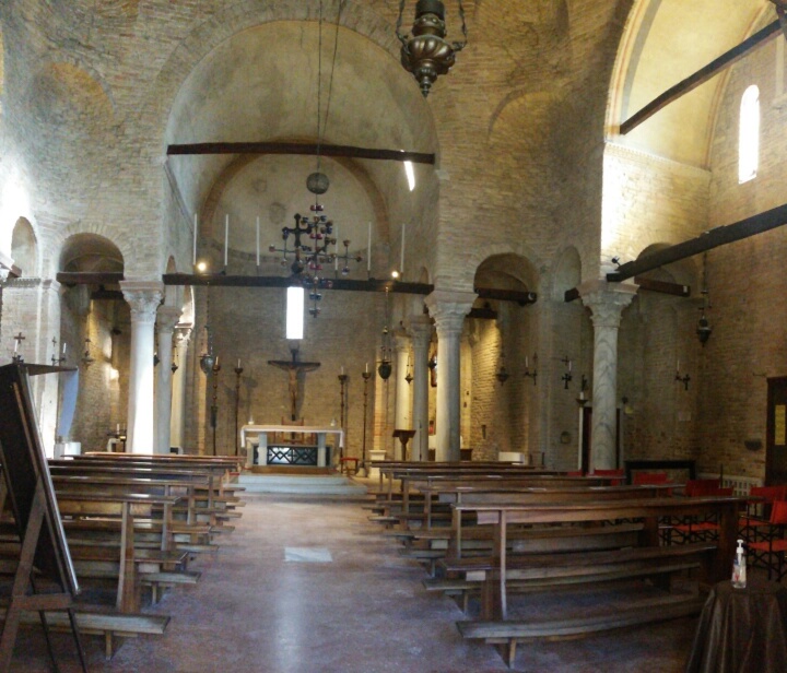 Ein Boot später habe ich dann doch genommen und mir vorher am Automaten zwei neue Fahrten auf die Karte geladen. Denn meine 90 min. waren jetzt natürlich wieder abgelaufen. Der Automat bestätigte, mein Geld abgebucht und die Fahrten geladen zu haben, und der Eingang zum Bootsanleger sagte „Piep – Karte leer. Bitte neue Fahrten laden.“ Das fand ich empörend. Zumal es schon das zweite Mal war, dass das passiert. Ich sagte es der Touristensortiererin des Actv, und sie sagte „Wo wollen Sie denn hin? Torcello? Das Boot da. Marsch, rauf.“ Also bin ich bis Burano ohne Ticket mitgefahren und musste dann die schwere Entscheidung treffen, ob ich von Burano nach Torcello jetzt noch eins löse oder wissentlich schwarzfahre (obwohl ich ja bezahlt hatte). Ich sag euch nicht, was ich gemacht habe. Auf Torcello selbst ist nicht mehr so viel los wie zu Gründungszeiten der Stadt. Es gibt noch fünf Restaurants der eher teuren Sorte, zwei bis drei Privathäuser, das Museum, zusätzlich ein privates Kunstmuseum und zwei Kirchen nebeneinander. Diese hier ist aus dem elften Jahrhundert: