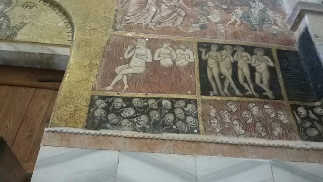 Die andere ist noch berühmter und schon im siebten Jahrhundert angefangen worden. Im neunten und elften dann jeweils erweitert und umgebaut. Es herrscht strenges Fotografierverbot, das auch regelmäßig eingefordert wird. Eine der Altarnischen mit viel goldenem Mosaik ist hinter Gerüst und Planen versteckt, die anderen sind auch weiträumig mit Seilen abgesperrt, so dass ein Opernglas eine gute Idee gewesen wäre. Der Fußboden ist wieder so ein Puzzlewahnsin aus klitzekleinen Marmordreiecken und -quadraten in den verschiedensten Farben, die zu kunstvollen Ornamenten gepflastert wurden. Die Wand am Ausgang ist ein riesiges Mosaik in sieben „Stockwerken“, das das jüngste Gericht sowie Himmel und Hölle in lustvoller Drastik sichtbar macht. Die Schädel mit den Würmern fand ich SO skurril, da musste ich tatsächlich mal eben warten, bis die Aufpasserin wegguckte, und dann heimlich illegal handeln. Das ist alles in herzallerliebsten winzigen Mosaiksteinchen hingebungsvoll geklebt.