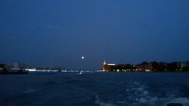 Auf der Rückfahrt mit der Linie 5.2 hing eine fette, lachsfarbene Vollmondscheibe am Himmel und lächelte milde. Leider kriegt das Handy (das frecherweise doch nicht so leer war wie behauptet und selbst nach Telefonat mir Barbara immer noch stur bei 6% Ladung war) diese Farben nicht die Spur hin. Und durch das Weitwinkelobjektiv sieht das auch eher nicht so groß aus. Aber es WAR spaktakulär.