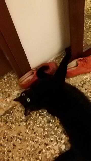 Zu Hause war niemand außer Kater Karlo, der erst mich begrüßte und dann meine Schuhe mit Liebesbeweisen überhäufte. Zum Größenvergleich: Die Schuhe sind Größe 40. Carlito ist also Größe 124 oder so.