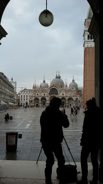 Nun wollte ich ja Samstag Morgen fahren und mich mit Matilde treffen und war schon ganz bekümmert, dass ich dieses Hochwasser um zwei Stunden verpassen würde. Und schließlich wollte ich ja auch gern nachsehen, ob Enricos Hanf-Kalk-Lehmputz die Flut überleben würde. Dann schrieb Mati, ob wir uns nicht statt Samstag auch Sonntag treffen könnten. Hurra! Ich wollte sowieso am liebsten noch deutlich verlängern. Und Laura hatte nichts dagegen, mir das Zimmer noch eine Nacht länger zu vermieten. Also zog ich mir am Samstagmorgen Luisas Segelschuhe und einen kurzen Rock an sowie warme Weste und Regenjacke. Der Schirm schlug sofort um, den packte ich gleich wieder zusammen und stemmte mich gegen den Wind. Um kurz nach zehn wollte ich erst noch zur Kirche Santa Maria dell’ Orto, in der Tintoretto und seine Tochter Marietta begraben sind. Sie soll eine der schönsten der Stadt sein, und Freitag war sie geschlossen gewesen, als ich ankam. Aber, wen wundert’s? Sie war auch jetzt geschlossen, obwohl sie um zehn hätte öffnen sollen. Für zwölf hatte ich mir einen Besuchstermin für die Dachterrasse vom Fondaco dei Tedeschi an der Rialtobrücke gebucht, davor reichte die Zeit noch, um über das steigende Wasser auf dem Marcusplatz zu staunen. Mit um die Knie schlabberndem, tropfendem Rock und sehr kalten nassen Füßen quatschte ich durch Regen und Pfützen. Der Marcusplatz war voller Touristen in Gummistiefeln, zum Teil bis zur Hüfte, oder grellbunten PVC-Überziehern für die Schuhe. Außerdem reichlich Kamerateams und Fotografen, die ihre Stative schon mal in Position brachten oder versuchten, in abenteuerlichen Kauerpositionen an den Gullis das herausblubbernde Wasser zu filmen.