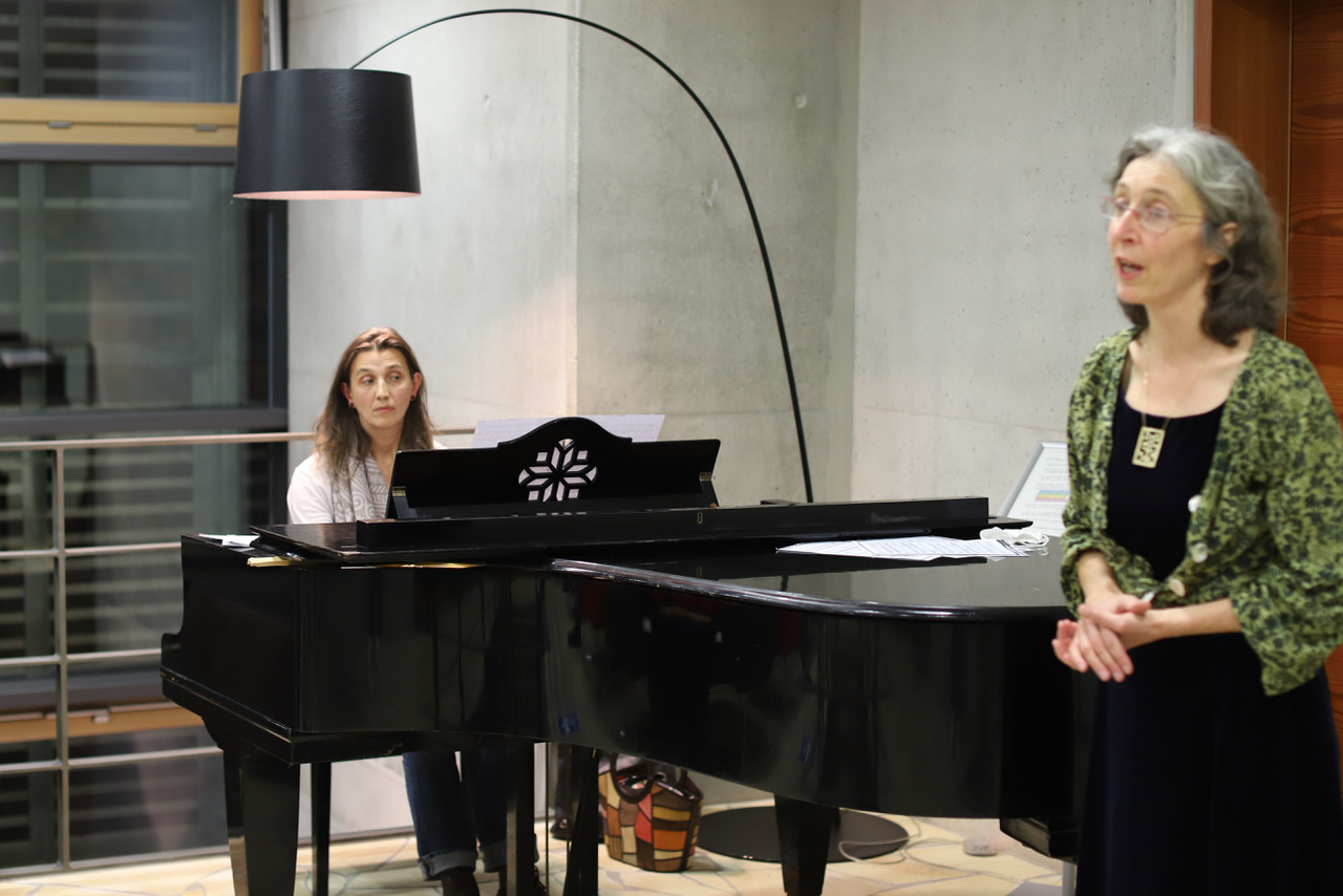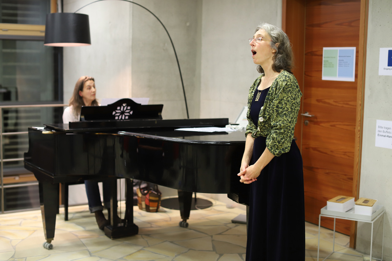 Mit Annette Cieslinski, meiner Pianistin, habe ich dann tatsächlich auch ein winziges Konzertlein gegeben. Ursprünglich fürs ganze Haus plus Gäste gedacht, dank Corona dann auf erst eine halbe Stunde, dann auf die TeilnehmerInnen meines Kurses beschränkt. Im zweistöckigen Foyer mit jeder Menge Platz. Und nach und nach sammelten sich im unteren Stockwerk unter der Galerie (aerosolgeschützt durch 10 m Abstand und eine solide Betondecke) immer mehr aus den anderen Kursen, das hörte man am Applaus. Angeblich haben sie sogar Text verstanden. Was TAT das gut, mal wieder richtig Musik zu machen. Miteinander. Für Leute. Für echte Menschen! Und anscheinend nicht nur mir, sondern sogar den ZuhörerInnen auch! Wenn man ihnen Glauben schenken darf. Ein riesiges Geschenk, das Ganze.