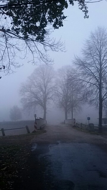 Aber offenbar haben sie es aufgegeben. Über viele Wasserläufe führte etwas, das sicher mal als Brücken gemeint gewesen war, anscheinend sogar für Fahrzeuge. Da lag jeweils eine riesige rostige Eisentonne im Wasser, schwimmend, zu der hin und von der weg jeweils zwei völlig durchgerostete parallele Eisenstege führten, ähnlich wie Auffahrschienen für einen Abschleppwagen, bloß länger und nicht so verlässlich. Sind da allen Ernstes mal Leute mit Treckern oder Ähnlichem drübergefahren? Man möchte es sich nicht ausmalen.